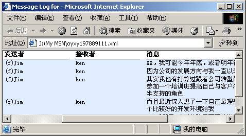 Documents\我接收到的文件\jim_xxx908142537\历史记录,然后只要你在该目录下用 IE 打开你曾经与那个人聊天的文件纪录,便可以清晰的看到你们的聊天记录了。如下图
