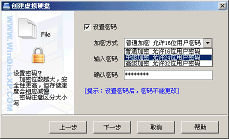 - 记住为您的虚拟硬盘设置密码,这一步不可少,因为设置密码才能有效防止其他人偷看您的邮件。