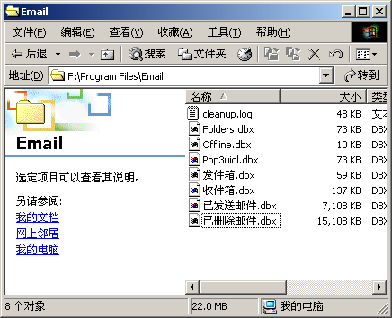 备份好上面目录例如:F:\Program Files\email 下面的所有文件,Folders.dbx、Offline.dbx、Pop3uidl.dbx、发件箱.dbx、收件箱.dbx、已发送邮件.dbx、已删除邮件.dbx,这些文件中保存了您的邮件,当然如果您原来的