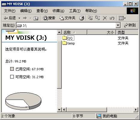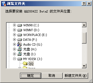- 创建完毕后,虚拟硬盘便可以用了,下面是安装 QQ 了。其实很简单,只需要安装的时候目录改道虚拟硬盘中即可,例如 : J:\QQ